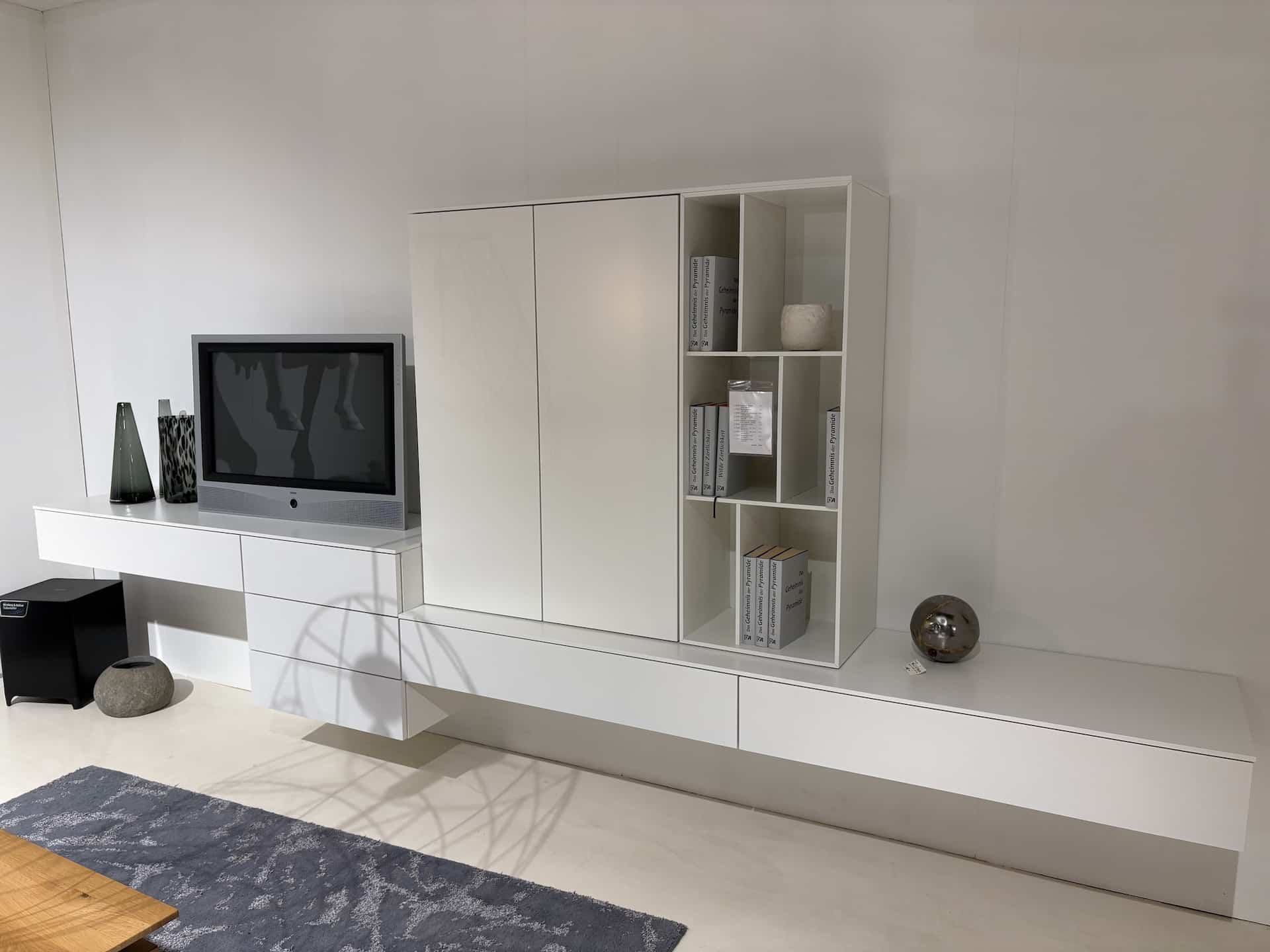 Das Möbelstück überzeugt mit einem klaren, zeitlosen Design in hochwertigem Lack „Verkehrsweiß“. Die puristische Optik verleiht jedem Wohnraum eine elegante und ruhige Atmosphäre. Gleichzeitig bietet die Wohnwand durch ihre durchdachte Aufteilung praktischen Stauraum sowie Platz für Dekoration und Mediengeräte – ideal für ein modernes Wohnkonzept.