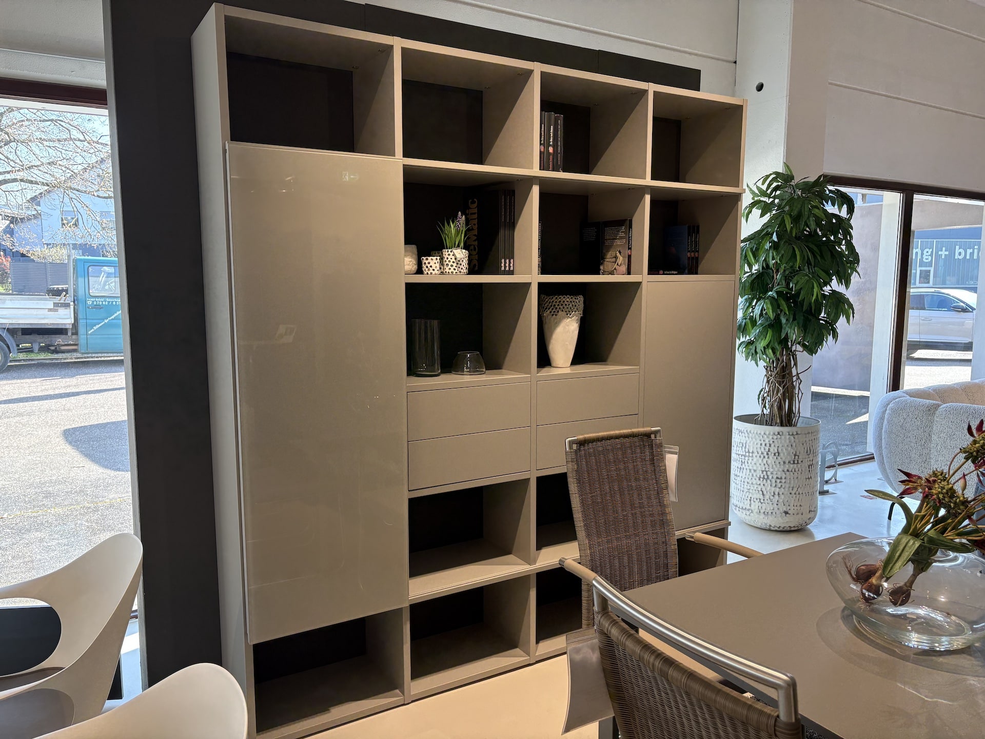 Das Möbelstück überzeugt durch sein klares, modernes Design in edlem Lack „Muschelgrau“. Die ruhige Farbgebung verleiht dem Wohnraum eine elegante und zeitlose Ausstrahlung. Dank des modularen Aufbaus bietet die Wohnwand vielseitige Möglichkeiten zur individuellen Gestaltung sowie praktischen Stauraum für Bücher, Deko und Mediengeräte – ideal für ein stilvolles und funktionales Wohnkonzept.